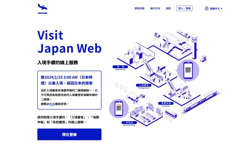 在入境前,旅客需至該網站登錄並創建QR Code,用於入境審查和海關申報。不過需注意,如攜帶超過100萬日圓現金或1公斤以上的純度90%以上黃金,需另填「支付方式等攜帶進口申告書」。