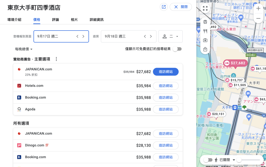 訂住宿|訂房前使用goole map確認各家平台價格